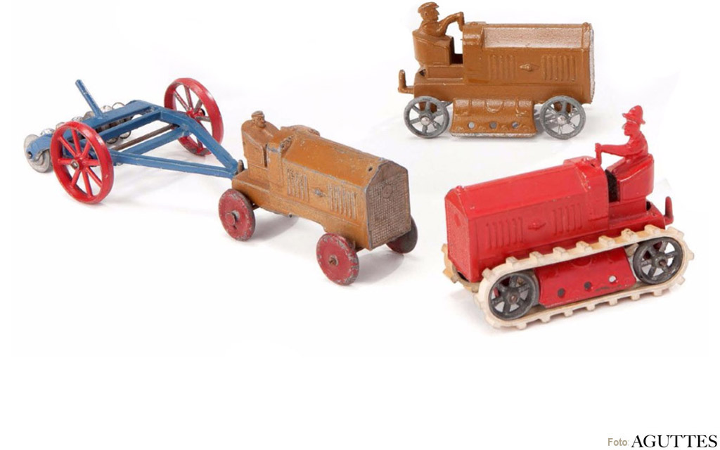 En la imagen están las tres versiones del tractor de plomo. Vemos un ejemplo, a la izquierda arrastrando de un arado, de cómo eran los primeros modelos, con la parte baja del chasis despejada, las ruedas de una pieza en plomo y un conductor de diseño simple. En la parte superior vemos una segunda versión con otra clase de chófer y una sección metálica entre los ejes. A la izquierda, en rojo, está el mismo modelo con cadenas de caucho.