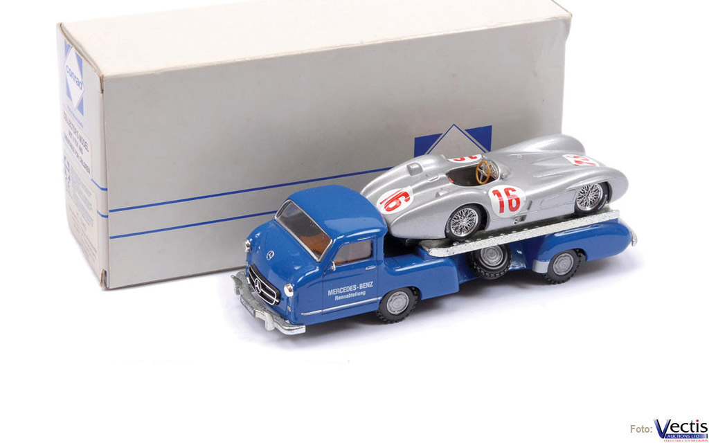 Pero si hay un modelo de Conrad que causó pasión en su momento fue el original Mercedes de transporte de coches de competición de 1955, que estuvo disponible en dos tonos distintos de color azul, y que en la imagen vemos acompañado de un adecuado modelo de la empresa italiana Brumm.