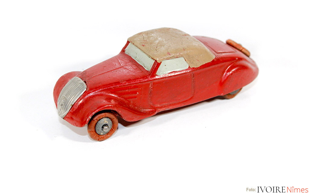• REF 605 DELAHAYE 135MA DE CARRERASVersión de 1938 o 1939 con ruedas de una pieza en plomo. Los preparativos bélicos acapararon la producción de caucho y ya no se pudieron hacer miniaturas con neumáticos.