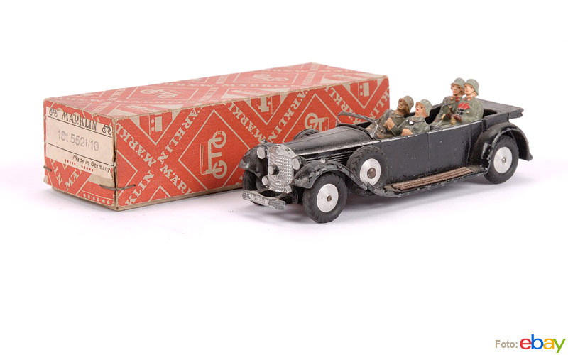 El espeluznante coche oficial de Hitler, un Mercedes 770K, estuvo disponible desde 1936 hasta 1940 sólo en color negro. Contaba con parabrisas en chapa y se comercializaba con o sin esvásticas sujetas a los guardabarros. También podía adquirirse con cuatro figuras incluidas: dos escoltas, conductor y dictador.
