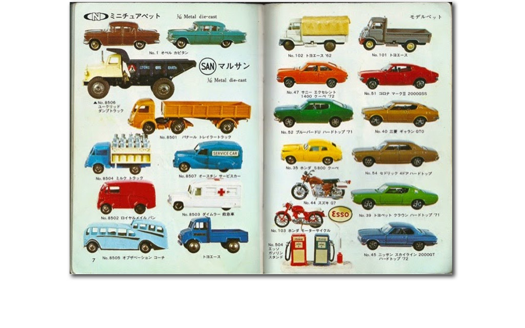 Una guía de modelos japoneses. En la página de la izquierda aparecen las dos variantes de color del Opel Kapitan de Nakayama y bajo ellos todos los Marusan.