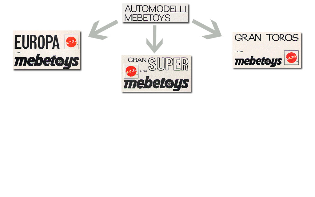 En 1969 Mebetoys pasó a ser propiedad de Mattel y esto supuso una reorganización de la colección a escala 1/43. Ese año la serie siguió conociéndose como ‘Automodelli Mebetoys’, pero en 1971 se dividió en tres series distintas: Serie 1000, Serie 800 y Serie 600, llamadas así en función del precio en liras italianas de cada modelo. La distinción no tenía utilidad práctica en lo tocante a la importación de los modelos, así que en 1972 se crearon dos colecciones nuevas: Serie Europa y Serie Gran Super en la que se englobaron los distintos modelos, sin que cambiara su número de referencia. Por otra parte, en 1972 Mattel canceló la colección Gran Toros - Sputafuoco de modelos superdeportivos, pero como tenía la marca registrada, la aprovecho para etiquetar con ella algunos de los modelos existentes, los de precio de venta más elevado, así como otros de nueva creación que se pusieron a la venta en los años setenta. Así, las cuarenta miniaturas que Mebetoys puso a la venta entre 1966 y 1969 acabaron englobándose en alguna de las tres series existentes: Europa, Gran Super y Gran Toros.