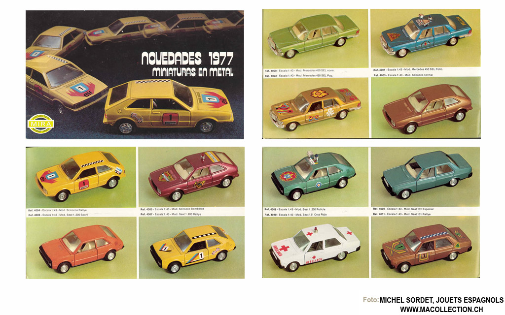 En 1977 el mercado español de modelos a escala 1/43 estaba dominado por la serie 100 de Joal, la colección Autopilen de Pilen y los Intercars de Nacoral. Mira consiguió posicionarse con unas miniaturas económicas pero de excelente diseño, acabado y presentación, centrando su sistema de distribución primordialmente en las tiendas del concurrido litoral levantino y aparcando la exportación. Aquellas miniaturas a escala 1/43 eran fieles a los más modernos estándares europeos y sus prestaciones eran equivalentes a los modelos franceses de Solido contemporáneos. Los Mira contaban con un fino acabado en zamac y sus modelos incorporaban apertura de puertas, base metálica, suspensión, faros y luces traseras en plástico, parachoques cromados y ruedas rápidas de tipo botón con las llantas insertadas en su interior. Durante 1977 las primeras unidades se distribuyeron en cajas de cartón con vitrina de celofán, pero pronto fueron sustituidas por bulbosas y elegantes cajas vitrina de plástico, similares a las utilizadas por Joal y Pilen. Al igual que estaba haciendo Schuco en Alemania con su serie 800, Mira desarrolló pocos modelos (ocho) de los que sin embargo existieron muy numerosas versiones (cuarenta en total). Cronológicamente, en 1977 aparecieron los cuatro primeros coches, en tres versiones distintas cada uno: Mercedes 450 SEL (normal, policía y pop), Volkswagen Sirocco (normal, rally y bomberos), Seat 1200 (normal, rally y policía) y Seat 131 (normal, ambulancia y rally). En 1978 se pusieron a la venta los modelos Citroën CX (normal, autopistas y ambulancia), Seat 128 (normal, rally y urgencias), Ford Fiesta (normal, rally y policía) y Chrysler 150 (normal, rally y bomberos). El mismo año se comercializaron seis variantes con baca y equipaje basados en el Volkswagen Sirocco, Seat 1200, Seat 131, Seat 128, Ford Fiesta y Chrysler 150. En 1979 fueron creadas las últimas variantes: Seat 131 taxi, Citroën CX policía y rally, Mercedes rally y Chrysler 150 policía. También salieron nuevas decoraciones de competición para los modelos ya existentes así como variantes dedicadas a personajes del cine y la televisión: Starsky y Hutch, El Santo, Superman y Spiderman, resultando estas últimas rocambolescas y deliciosamente ingenuas. Los Mira a escala 1/43 se comercializaron a lo largo de toda la década de los ochenta y a comienzos de los noventa todavía resultaba fácil encontrarlos en muchas jugueterías y papelerías. Ahora, gracias a la desinteresada colaboración de Michel Sordet, Gamas43 puede mostrar todos aquellos modelos.